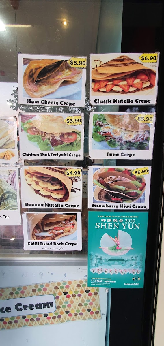 Crispy Crepe Menu: This section offers a selection of thin, crispy crepes with different fillings including sweet options like Classic Nutella, Strawberry Kiwi, Chocolate Supreme, and Banana Nutella crepes, as well as savory choices such as Chilli Dried Pork, Ham Cheese, Chicken Teriyaki, and Tuna crepes.
