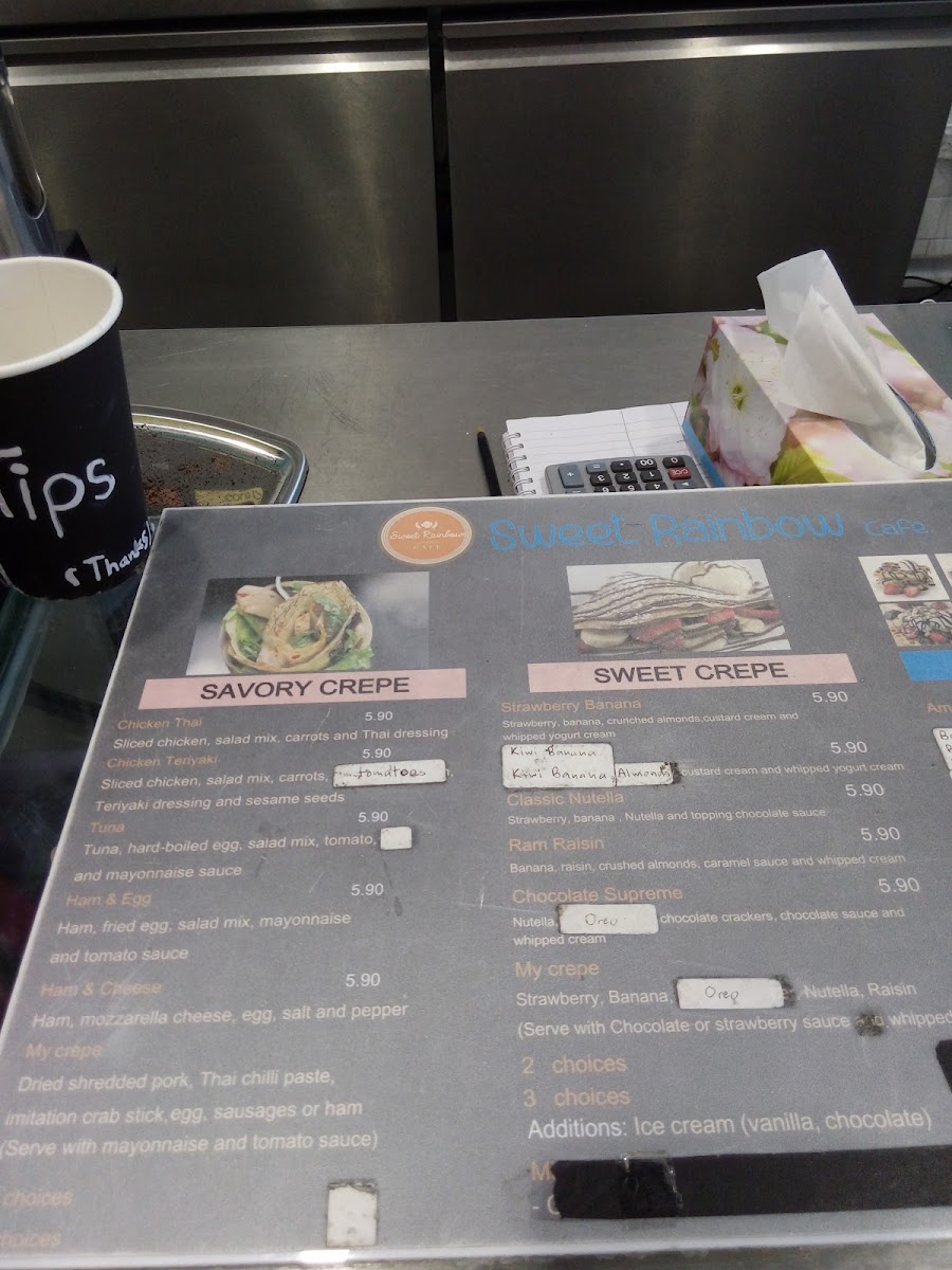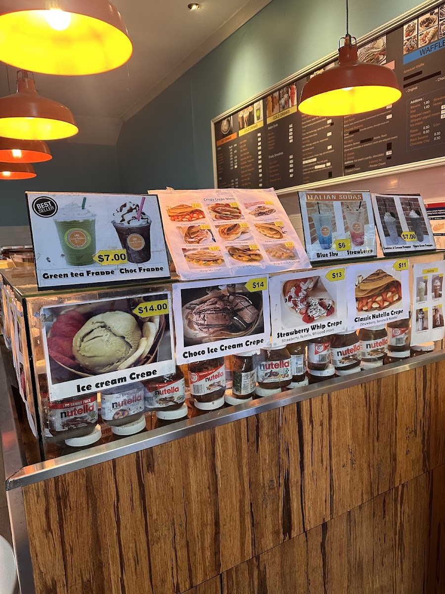 Additional Items: The menu also features other light snacks and desserts like Banana Choco Waffle and various ice cream choices that can be paired with crepes.